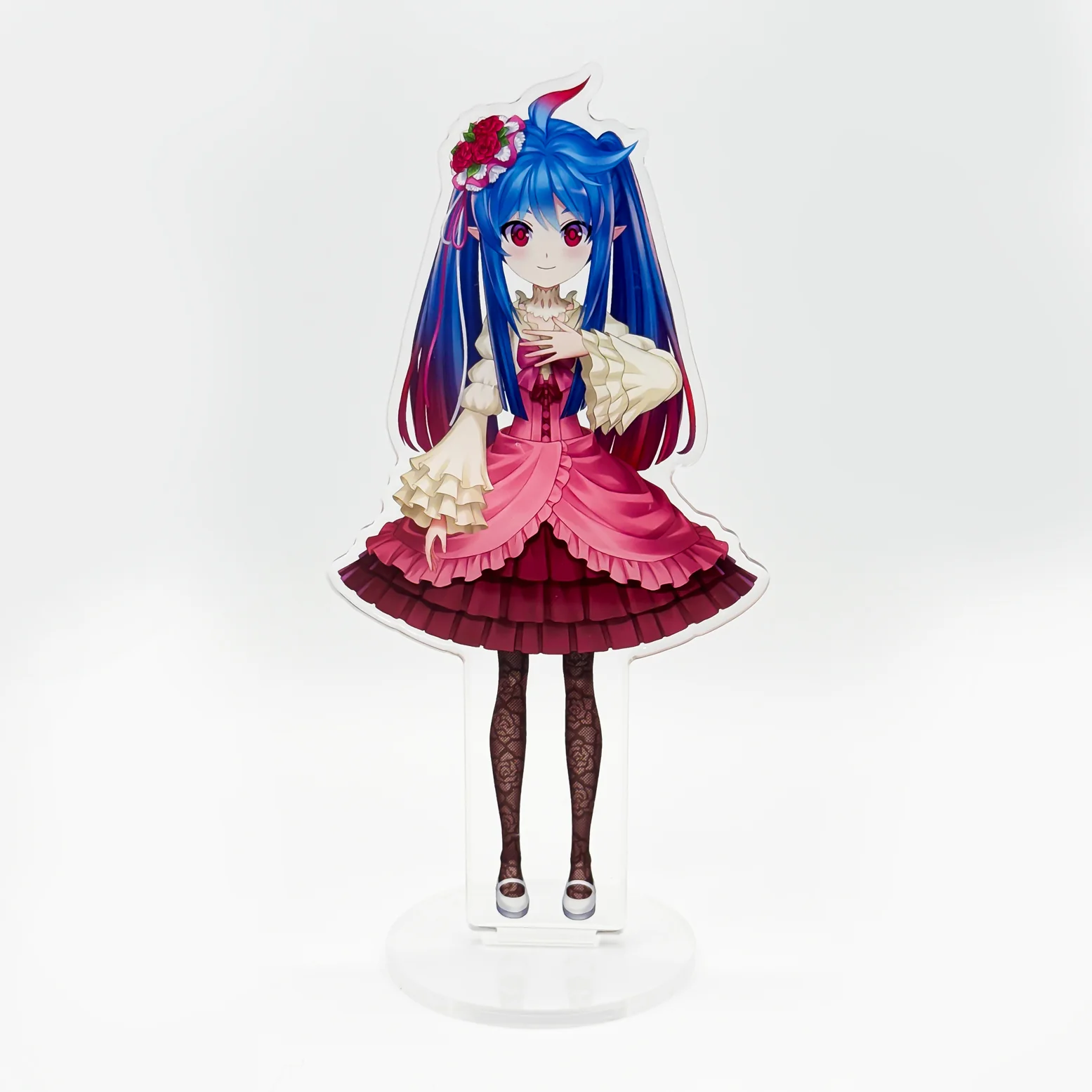 An acrylic standee of Leaflit, cosplaying as Furudo Erika. It features a cosplay dress and a twin-tail hairstyle.