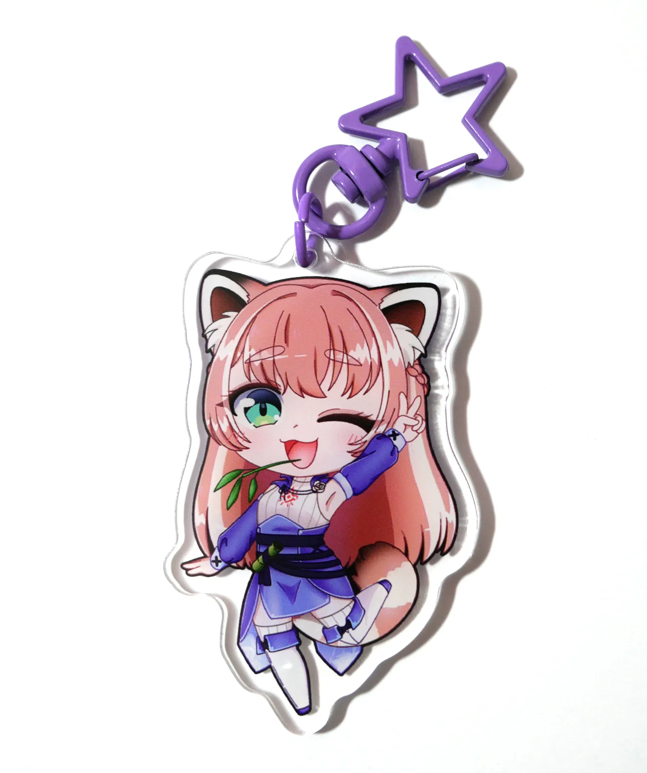 A keychain of Yuria in her Adventurer outfit! You can take her along with you to eat delicious food to remind you that anything is better than only having bamboo to eat. Comes with a purple star keychain that matches the Leaflit and Asari keychains and makes a wonderful ornament for backpacks!